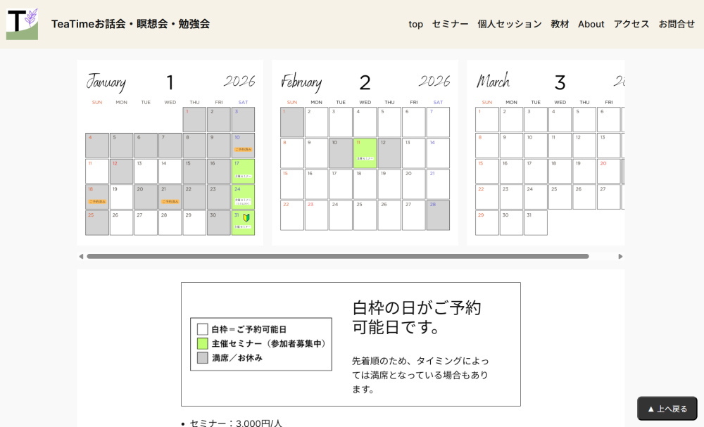 開催日や空席情報が確認できるカレンダーが、トップ・イベント・セミナー・セッション各ページに設置!確認しやすく改善しました!