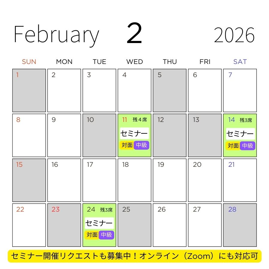 ※開催日は、変更になる場合もあります。また、リクエストにより開催日を追加する場合もあります。リクエストは3名様~承っております。専用サイトはこちら