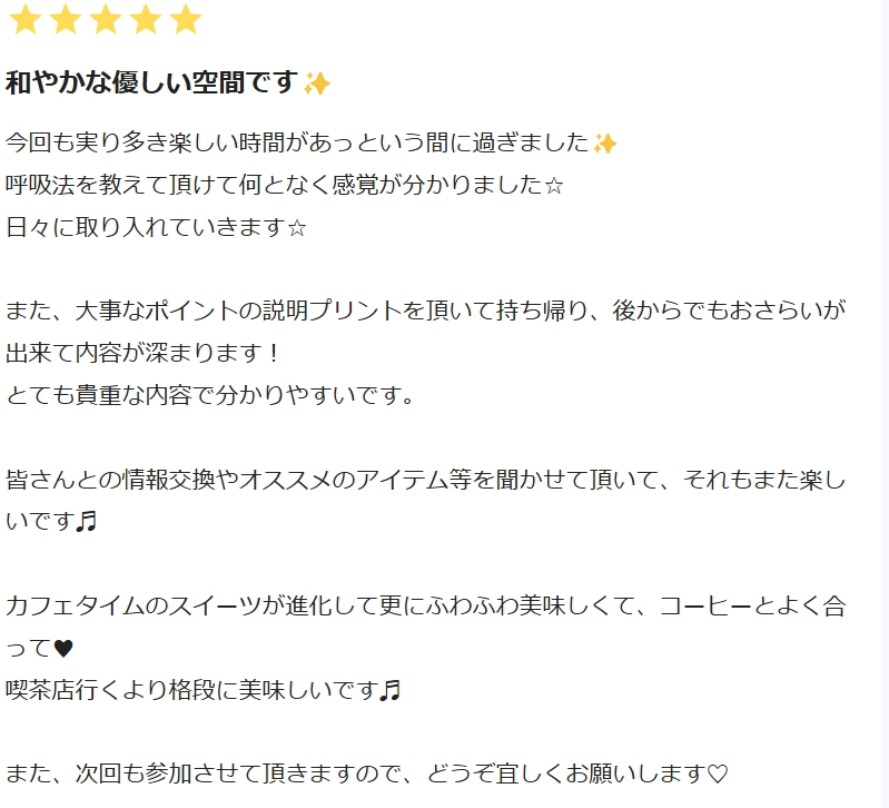 今回も実り多き楽しい時間があっという間に過ぎました✨ 呼吸法を教えて頂けて何となく感覚が分かりました☆ 日々に取り入れていきます☆ また、大事なポイントの説明プリントを頂いて持ち帰り、後からでもおさらいが出来て内容が深まります! とても貴重な内容で分かりやすいです。 皆さんとの情報交換やオススメのアイテム等を聞かせて頂いて、それもまた楽しいです♬ カフェタイムのスイーツが進化して更にふわふわ美味しくて、コーヒーとよく合って♥ 喫茶店行くより格段に美味しいです♬ また、次回も参加させて頂きますので、どうぞ宜しくお願いします♡