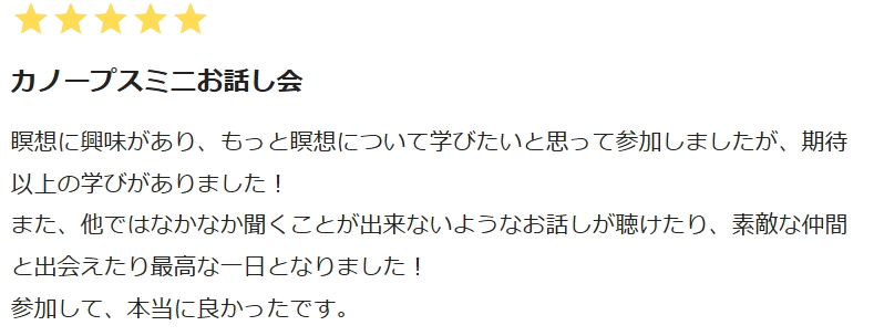 瞑想に興味があり、もっと瞑想について学びたいと思って参加しましたが、期待以上の学びがありました! また、他ではなかなか聞くことが出来ないようなお話しが聴けたり、素敵な仲間と出会えたり最高な一日となりました! 参加して、本当に良かったです。