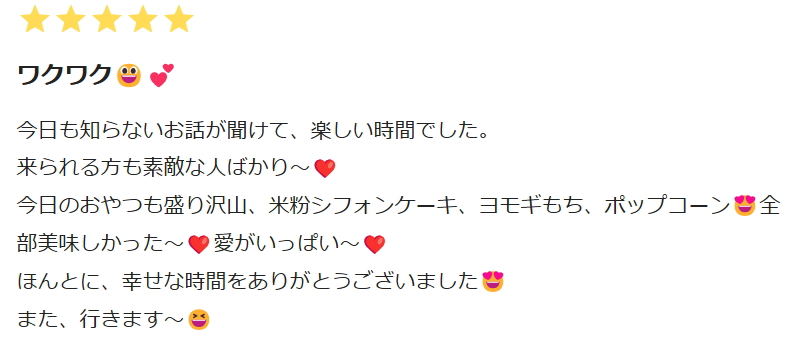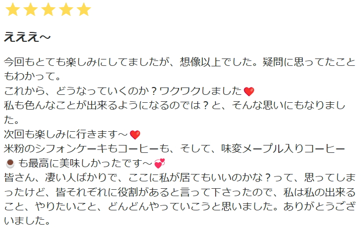 今回もとても楽しみにしてましたが、想像以上でした。疑問に思ってたこともわかって。 これから、どうなっていくのか?ワクワクしました❤️ 私も色んなことが出来るようになるのでは?と、そんな思いにもなりました。 次回も楽しみに行きます~❤️ 米粉のシフォンケーキもコーヒーも、そして、味変メープル入りコーヒー☕も最高に美味しかったです~💞 皆さん、凄い人ばかりで、ここに私が居てもいいのかな?って、思ってしまったけど、皆それぞれに役割があると言って下さったので、私は私の出来ること、やりたいこと、どんどんやっていこうと思いました。ありがとうございました。